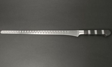 Eine besondere Form des Schinkenmessers ist das Lachsmesser. Es hat eine enorm lange, dünne und flexible Klinge. In moderneren Varianten ist es zudem mit Kullen versehen, die die Reibung am Schnittgut noch weiter reduzieren. Nur mit diesem Werkzeug lassen sich stilecht die unvergleichlichen, hauchfeinen Scheiben vom Serranoschinken schneiden. Natürlich, wie der Name schon sagt, ist es ebenso dafür gedacht, hauchfeine Tranchen vom Fischfilet zu schneiden.