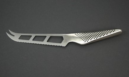 Käsemesser mit hochstehenden, gewinkelten Griff. Dadurch lässt sich das Messer besser führen. Die eingestanzten Löcher bilden beim Schneiden ein Luftpolster zwischen Käse und Messer. Dadurch löst sich der Käse leichter von der Klinge.
