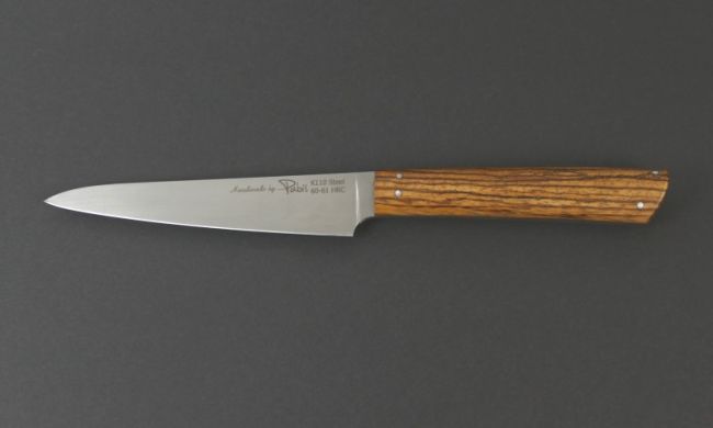 Für seine Klingen nutzt Pabis den sehr verschleißfesten Bohler K110 Stahl. Per Definition zwar noch rostfrei, allerdings nicht zu 100prozent. Bei längerer Einwirkung von Wasser oder Säuren kann sich, ähnlich wie bei Carbonstahlmessern, eine hauchdünne Patina aus Metalloxyden ausbilden. Diese lässt sich zwar leicht mit Metallpolitur entfernen, wir empfehlen jedoch diese als Schutz auf der Klinge zu belassen. K110 Stahl hat ein hervorragendes Schärfepotential und eine lange Standzeit. Mit einem einfachen keramischen Wetzstab lässt sich die Schärfe leicht pflegen. Angelegt ist die Schneide, wie bei japanischen Messern, mit 15 Grad. Die Härte liegt zwischen 59 und 60 HRC.