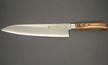 Im Kern der Klinge kommt VG5 zum Einsatz. Ein bewährter, sehr harter Stahl der sich hervorragend ausschleifen lässt und im Gegensatz zu VG10 noch etwas bruchfester ist. Er wird auf 60±1HRC gehärtet. Die Flanken der Klinge werden durch zwei Lagen zähem Edelstahl gestützt. Dieser Aufbau (San Mai) hat in Japan eine lange Tradition. Er ermöglicht eine extrem scharfe aber dennoch stabile Schneide.