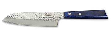Die japanische Messerschmiede Yaxellist bekannt für technische Innovationen und modernes Design. Mit der Serie Blue Breeze spricht der Hersteller sowohl optisch als auch preislich gezielt ein jüngeres Publikum an. Die markanten Griffe aus blauem Pakkaholz und die mittels Tsuchime-Technik (Hammerschlagoptik) veredelte Dreilagen-Kompositklinge verleihen dem Messer eine interessante Optik. Es überzeugt aber auch durch sehr gute technische Werte.
